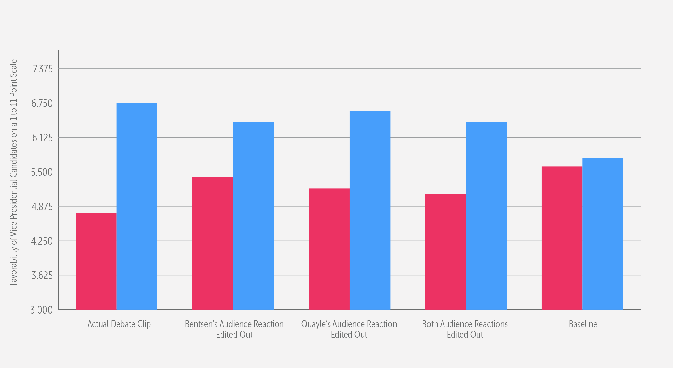 Audience reactions had a significant impact on the favorability and perceptions of the candidates (Figure 2). Those in the baseline condition rated Bentsen only slightly more favorably than Quayle while the difference in ratings in the full clip condition is a little over 2 scale points. When the reaction to Bentsen is edited out, his favorability drops and Quayle’s increases. When the reaction to Quayle’s is edited out in condition 3, his ratings are lower than in condition 2 but higher than condition 1 suggesting that this audience response had a negative effect on reception of the Republican vice presidential nominee. All differences are statistically significant.