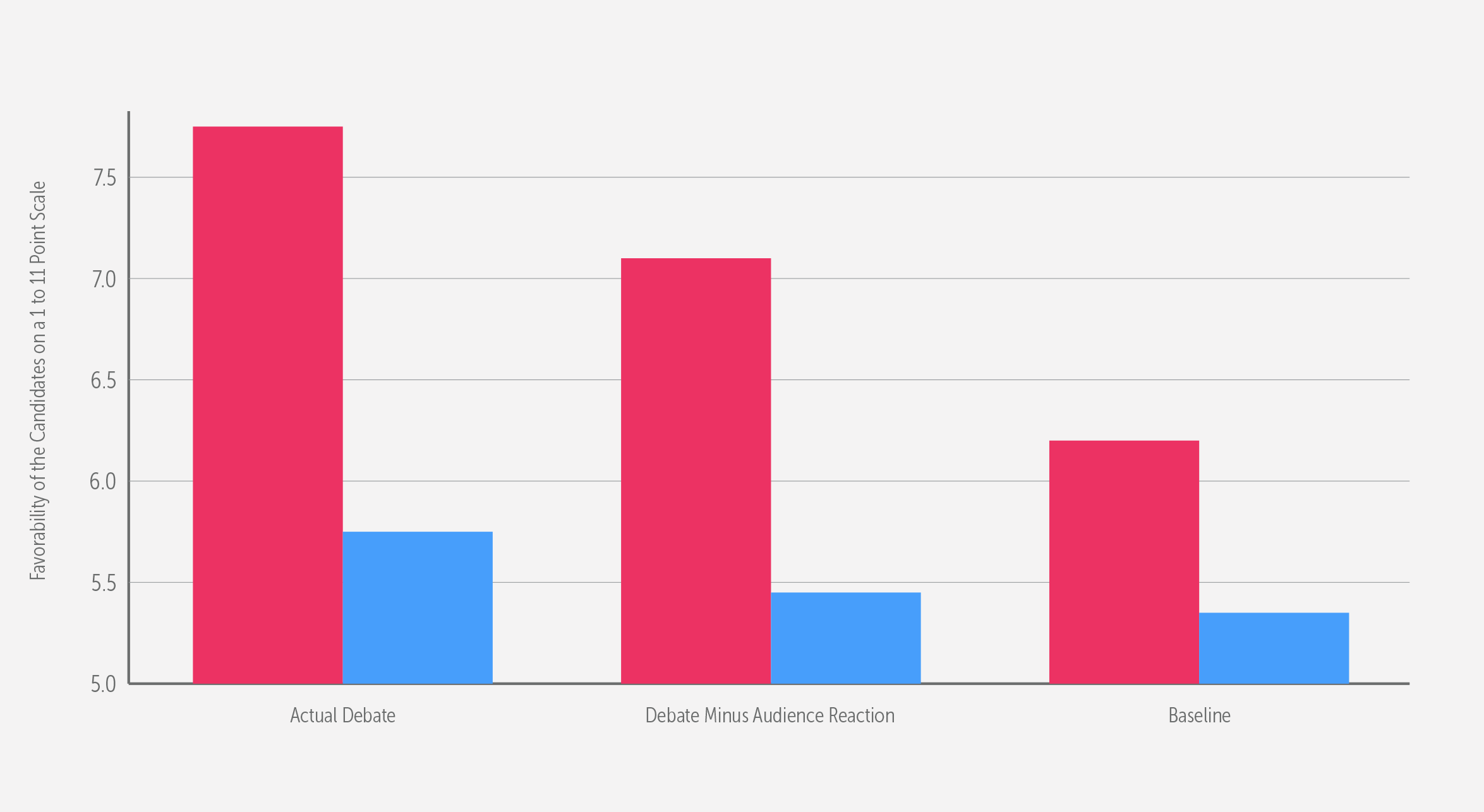 The only major published study of general election debate audience reactions showed that they are able to affect viewers’ perceptions of a candidate. In four experiments testing the impact of audience reaction on viewers’ rating of the candidates’ debate performance and traits, Fein, Goethals, and Kugler16 found consistent effects. APPC studies conducted for the Working Group confirm these findings.