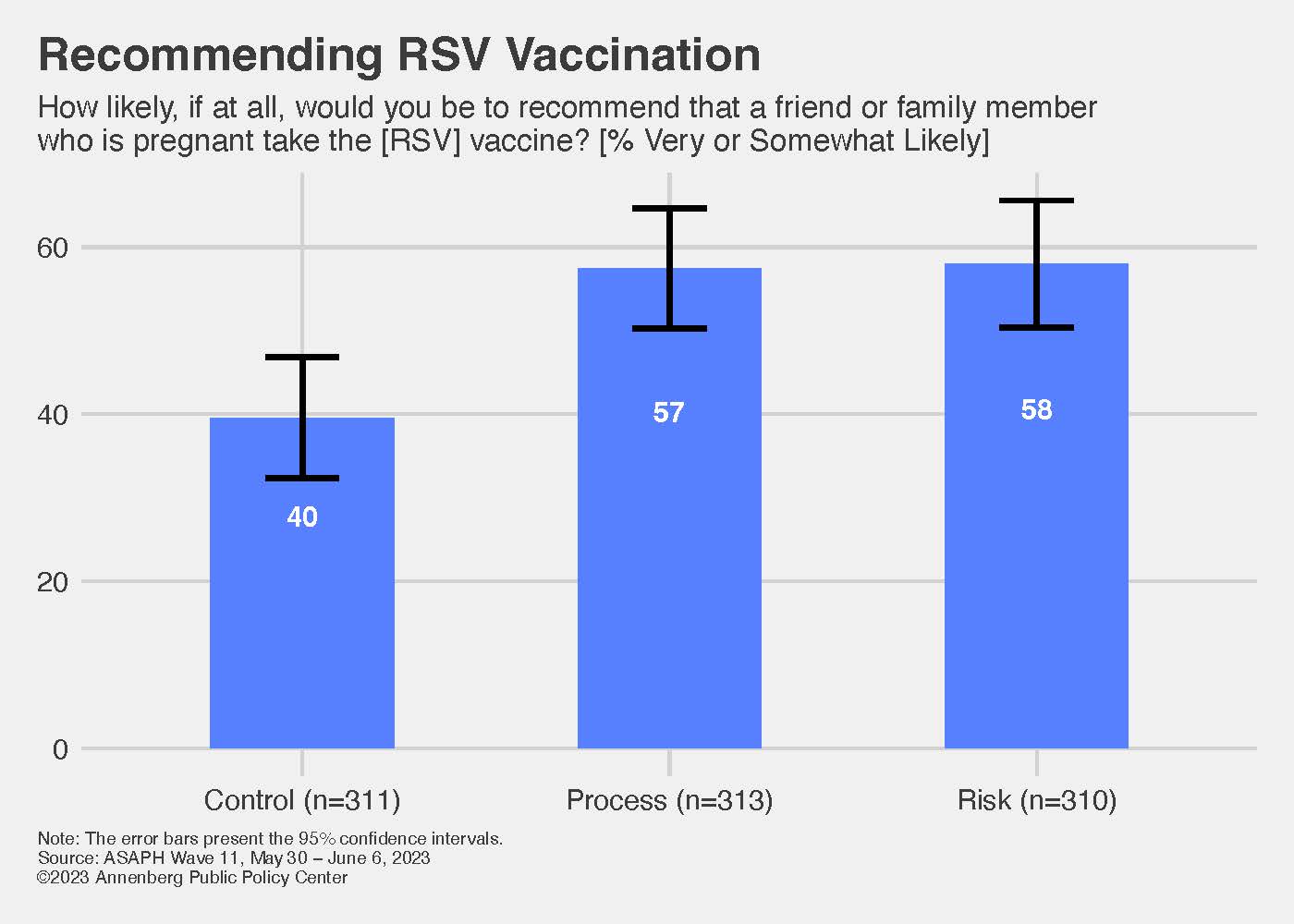 The experiment was conducted by an Annenberg Public Policy Center (APPC) team as part of a May 31-June 6, 2023, nationally representative panel survey on RSV, vaccination, and maternal health. Researchers found that 57% of those in a group exposed to a flowchart of the FDA vaccine approval process (see Appendix 1) were very or somewhat likely to recommend the RSV vaccine to a pregnant family member or friend, compared with 40% of those in a control group not shown the chart. Those in a third group, informed about the risks of RSV, were also more likely (58%) to recommend the vaccine.