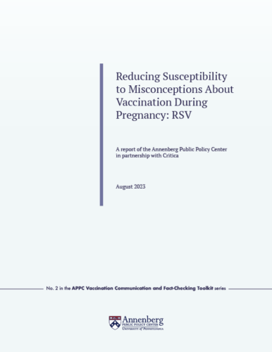 The study is part of a new white paper from the Annenberg Public Policy Center of the University of Pennsylvania that looks at misconceptions about vaccination during pregnancy. “Reducing susceptibilities to misconceptions about vaccination during pregnancy: RSV” is the second in a series of Vaccine Communication and Fact-Checking Toolkit reports produced in partnership with Critica, a nonprofit organization that seeks to improve public understanding and acceptance of scientific evidence and counteract health- and science-related misinformation.